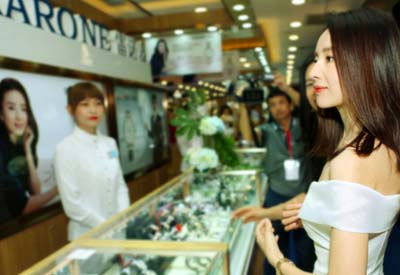 优雅女神董洁一身梨白小礼服惊喜现身雷诺表专柜,一同品鉴雷诺新品腕表。