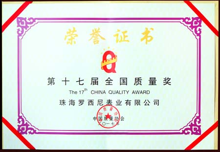 2017年,珠海罗西尼表业有限公司金榜题名,与长飞光纤光缆股份有限公司、北京东方雨虹防水技术股份有限公司、杭州老板电器股份有限公司、江苏今世缘酒业股份有限公司等5家大中型企业一道荣获“全国质量奖”,另有“三代核电(ACP1000)反应堆及一回路系统研制”等5个项目“全国质量奖卓越项目奖”;国家电网公司客户服务中心等2家组织“全国质量奖管理特色奖”;海能达通信股份有限公司等3家组织“全国质量奖入围奖”;新疆金风科技股份有限公司等16家组织“全国质量奖鼓励奖”。同时,罗西尼还再次摘取“全国实施卓越绩效管理模式先进企业”桂冠。