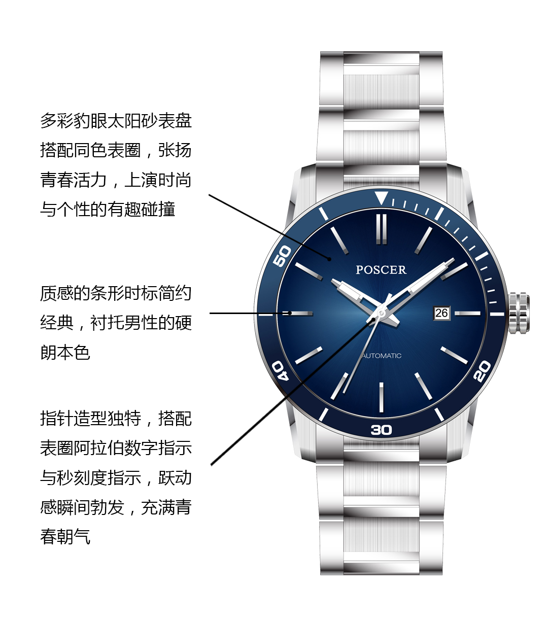腕表整体青春时尚,以绚烂的表盘传达个性男生的时尚态度,深海蓝表盘搭配原钢色金属表带,精致有型,举手投足间传达佩戴者的不羁个性。