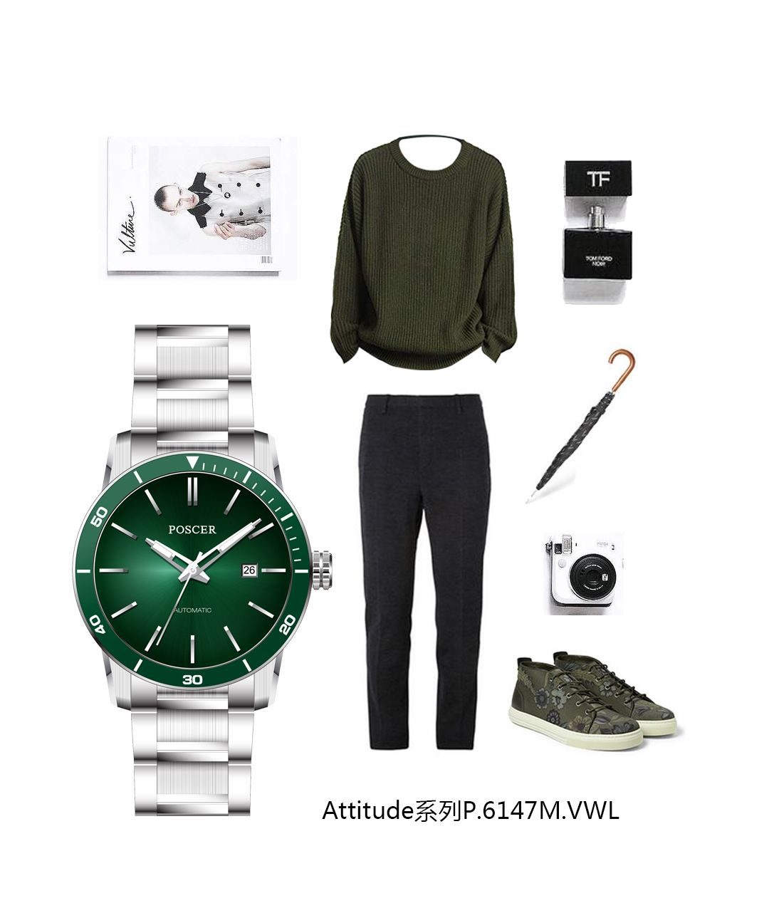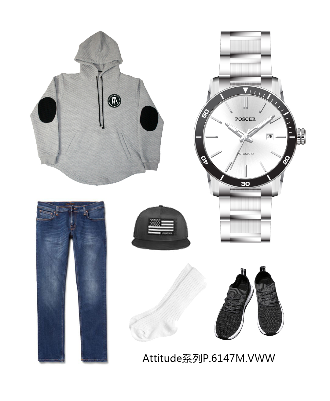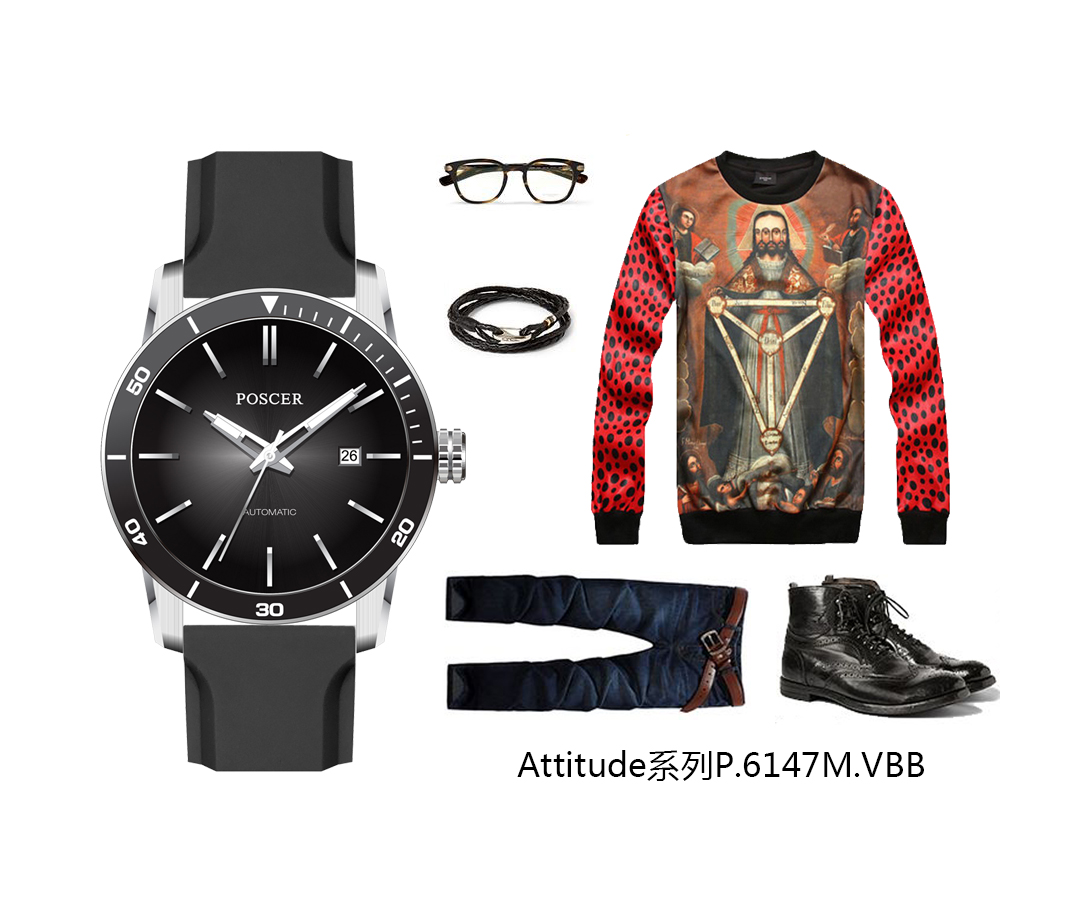 Attitude系列以极具创意与趣味的色彩,碰撞出时尚新风潮,时尚有型,诠释不同风格的自己。厚卫衣、丹宁长裤与运动鞋搭配纯净白机械机芯腕表,运动少年精彩亮相。