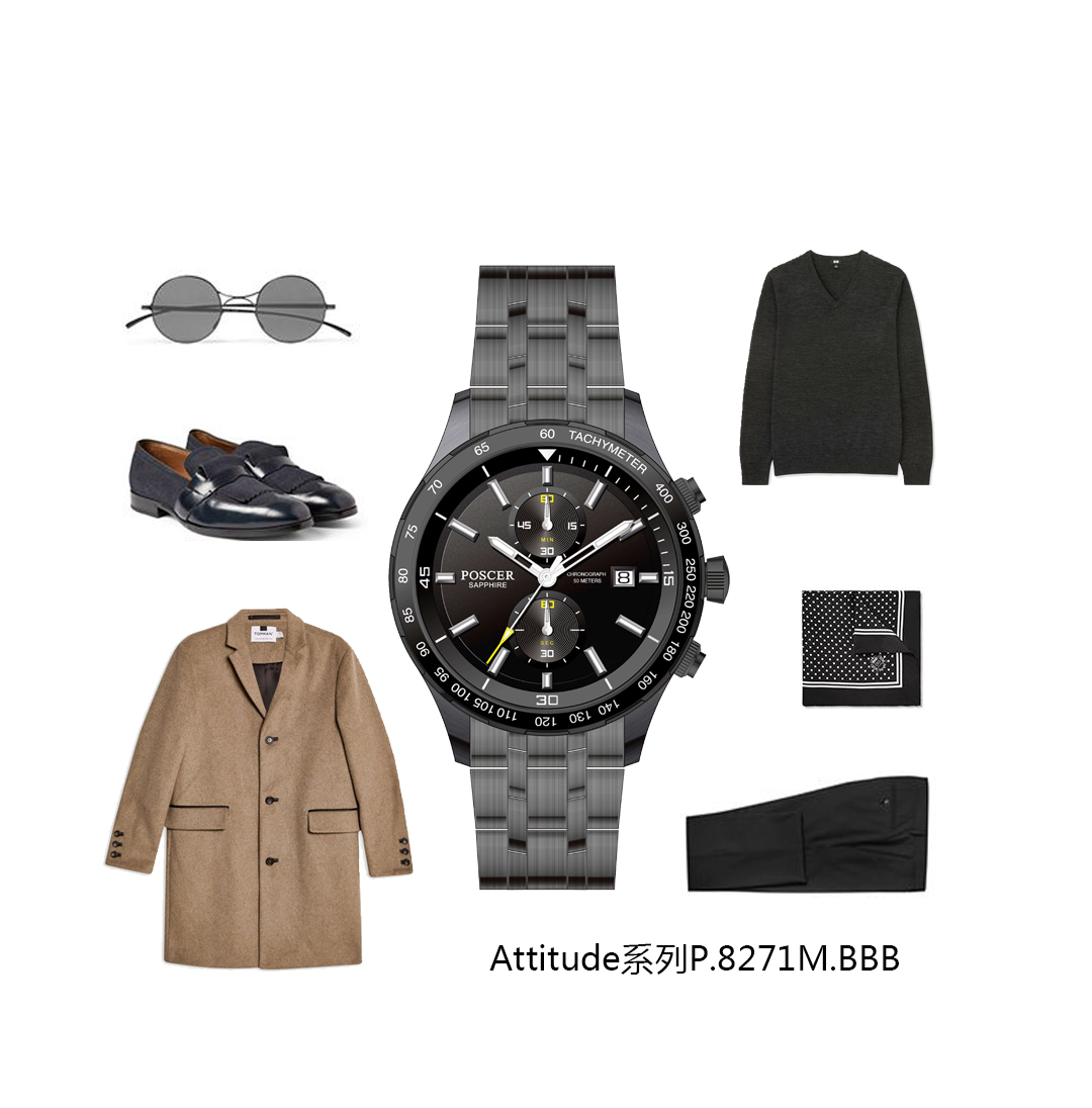 棕色毛呢大衣搭配通体黑色腕表,在秋冬冷意之中营造温暖氛围。