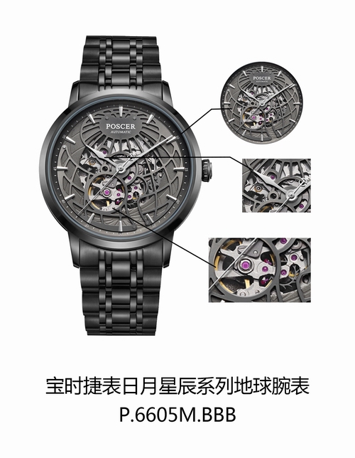 这款腕表整体采用精钢材质,低调有型;浑然一体的劲黑色调彰显男士的果敢帅气;表盘设计灵感来自地球经纬线,镂空地球图案让内部永恒律动的机芯越发凸显,时刻演绎机械与时尚的完美结合,令人眼前一亮。