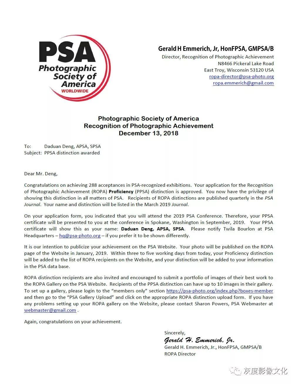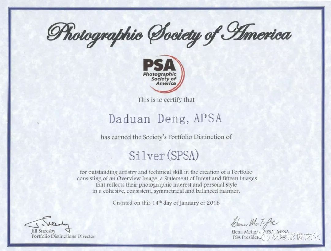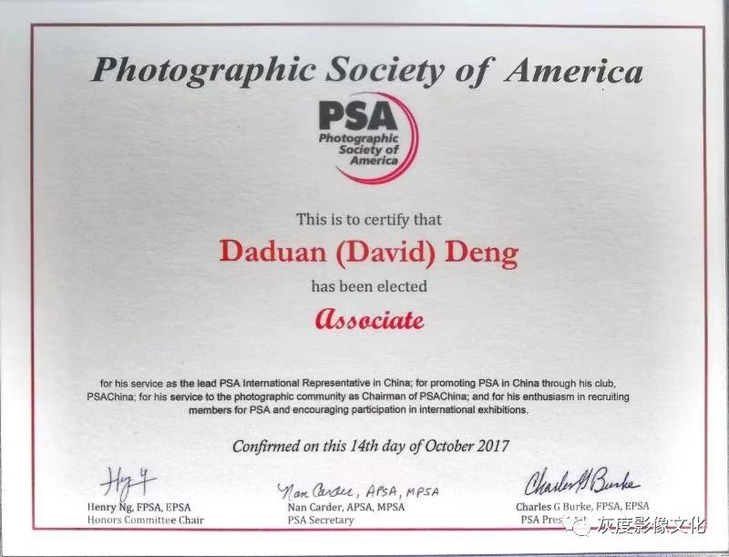 2018年12月13日,邓大端先生接美国摄影学会名衔委员会邮件,通过了美国摄影学会影艺精通会士(PPSA)名衔审核,这是继他在2017年9月美国匹茨堡年会上领取美国摄影学会杰出贡献名衔APSA,2018年1月获批组照考级名衔SPSA后,获得的第三类、也是最后一类名衔,至此,他成了中国唯一一位集美国摄影学会三大名衔于一身的卓越摄影人。