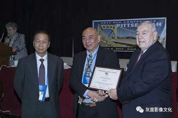 2017年9月邓大端先生在美国摄影学会匹茨堡年会上,从时任PSA主席Charles Burke先生手中接过APSA名衔证书。