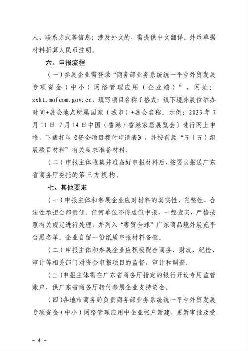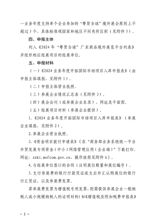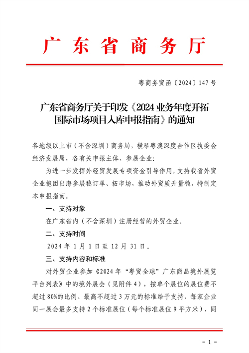 为进一步发挥外经贸发展专项资金引导作用,支持我省外贸企业抱团出海参展稳订单、拓市场,推动外贸质升量稳,广东省商务厅特制定2024年“粤贸全球”展位费补贴的申报指南。现转发如下: