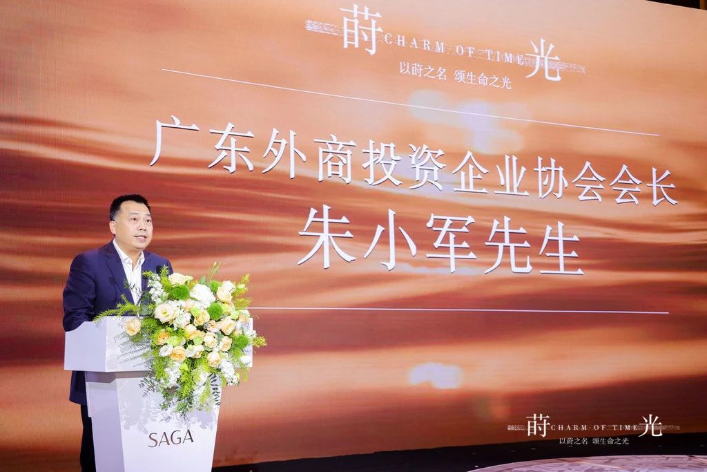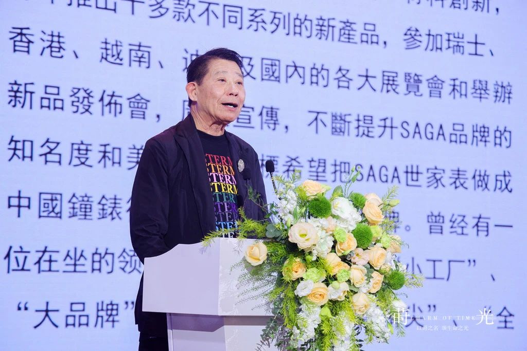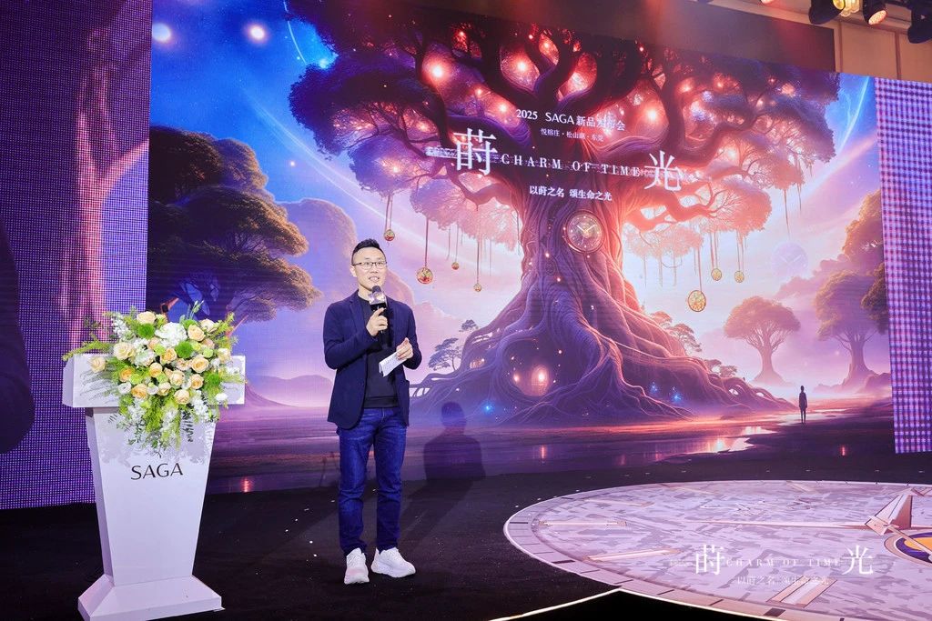 紧接着,得利集团总经理刘仁上台发表致辞,分享他与梁伟浩先生为 SAGA 品牌共同走过的足迹,致敬光辉岁月,迎接璀璨未来。盛会上,刘仁先生还为嘉宾们介绍 SAGA 新品发布会的核心理念,结合产品灵感与生活经历,生动解读富有创意且意义深刻的「莳光」概念,以「莳」之名,颂扬生命之光。