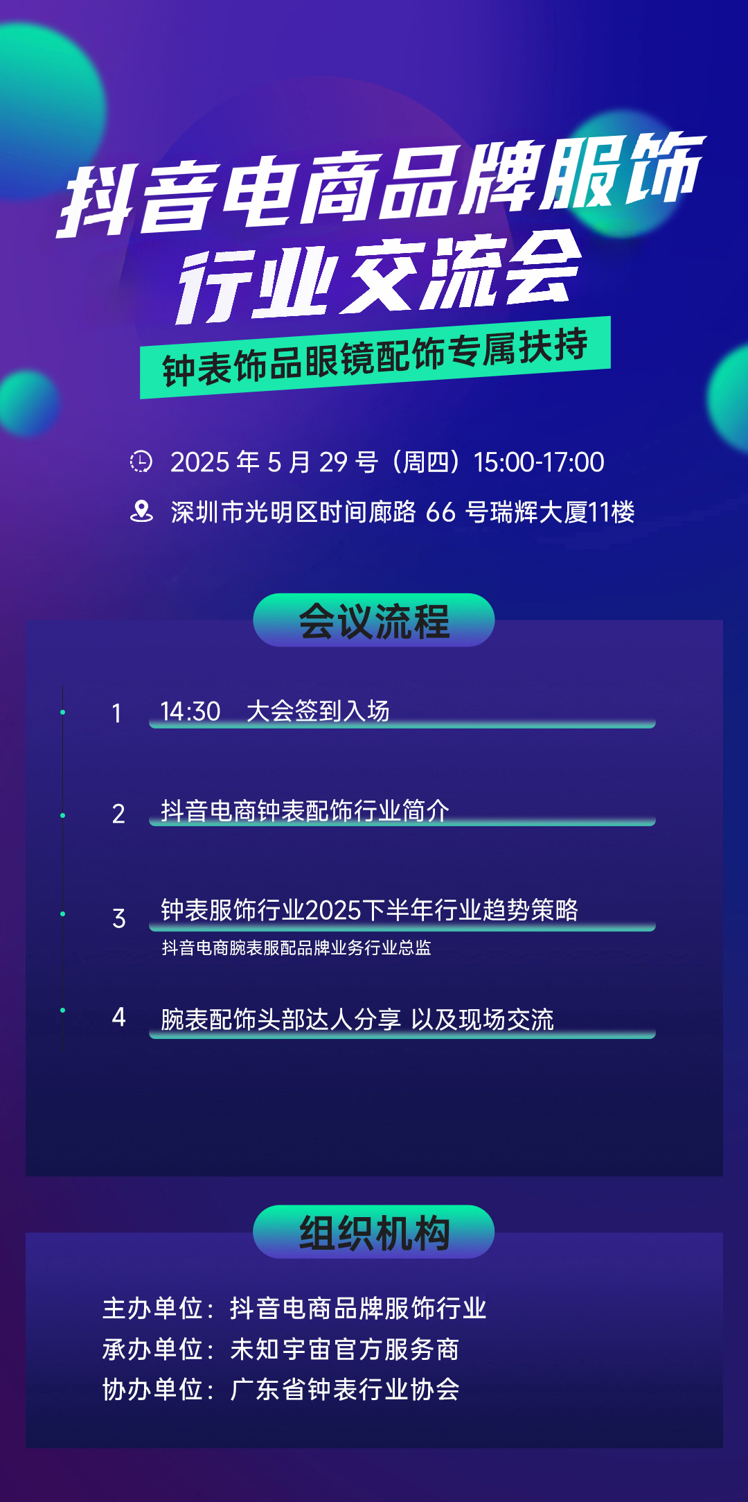 2025年5月29日(星期四),在深圳瑞辉大厦举办抖音电商钟表行业招商会。抖音电商作为全域兴趣电商领跑者,依托8亿+日活流量、精准人群标签与内容生态势能,正成为钟表品牌抢占年轻消费心智、引爆品销增长的核心阵地!届时抖音电商核心团队现场为商家分享行业趋势策略和入驻权益详解,头部达人现场与商家选品互动,诚邀钟表品牌参会,共拓破亿商机。