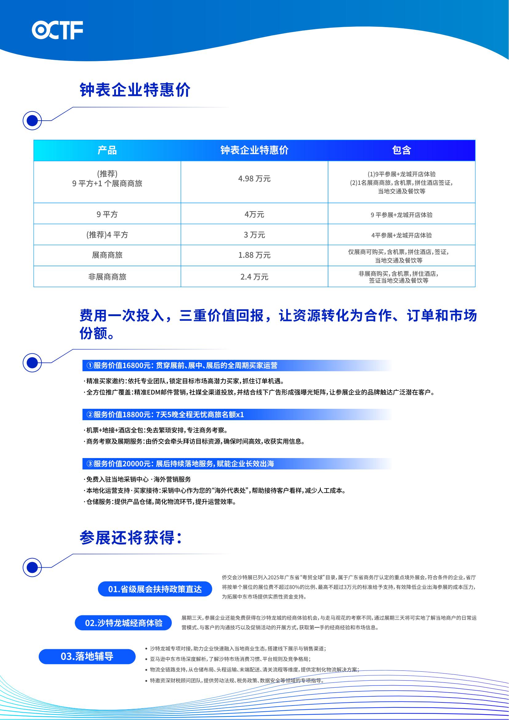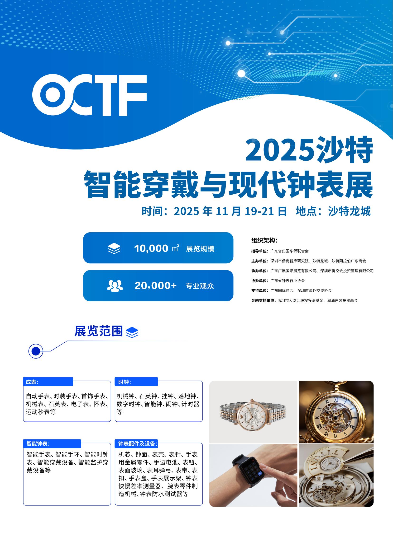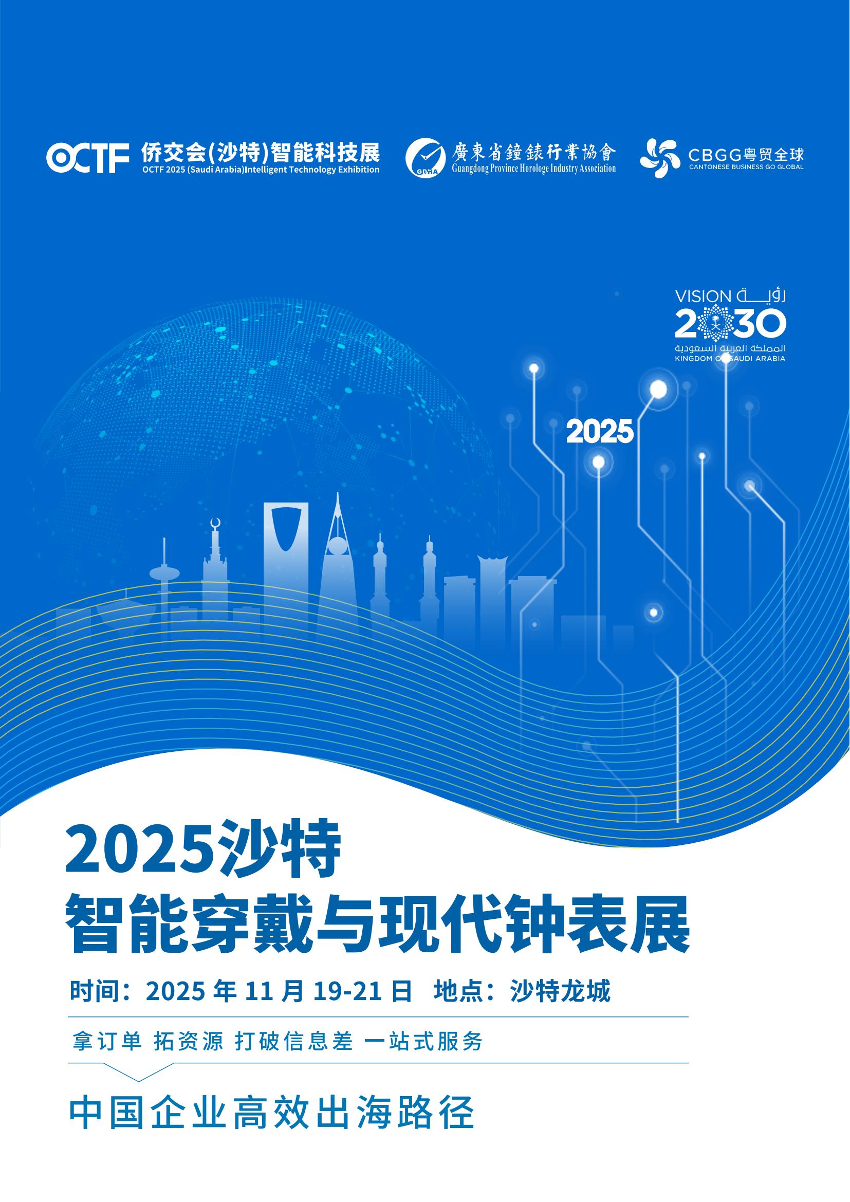 【本会讯】为提振消费,出海抢滩,广东省钟表行业协会联合侨交会集团举办“侨交会 2025 沙特智能科技展暨智能穿戴与现代钟表展”,这是沙特首届开放举办的钟表展,优惠多,机会难得,敬请钟表同仁特别关注。