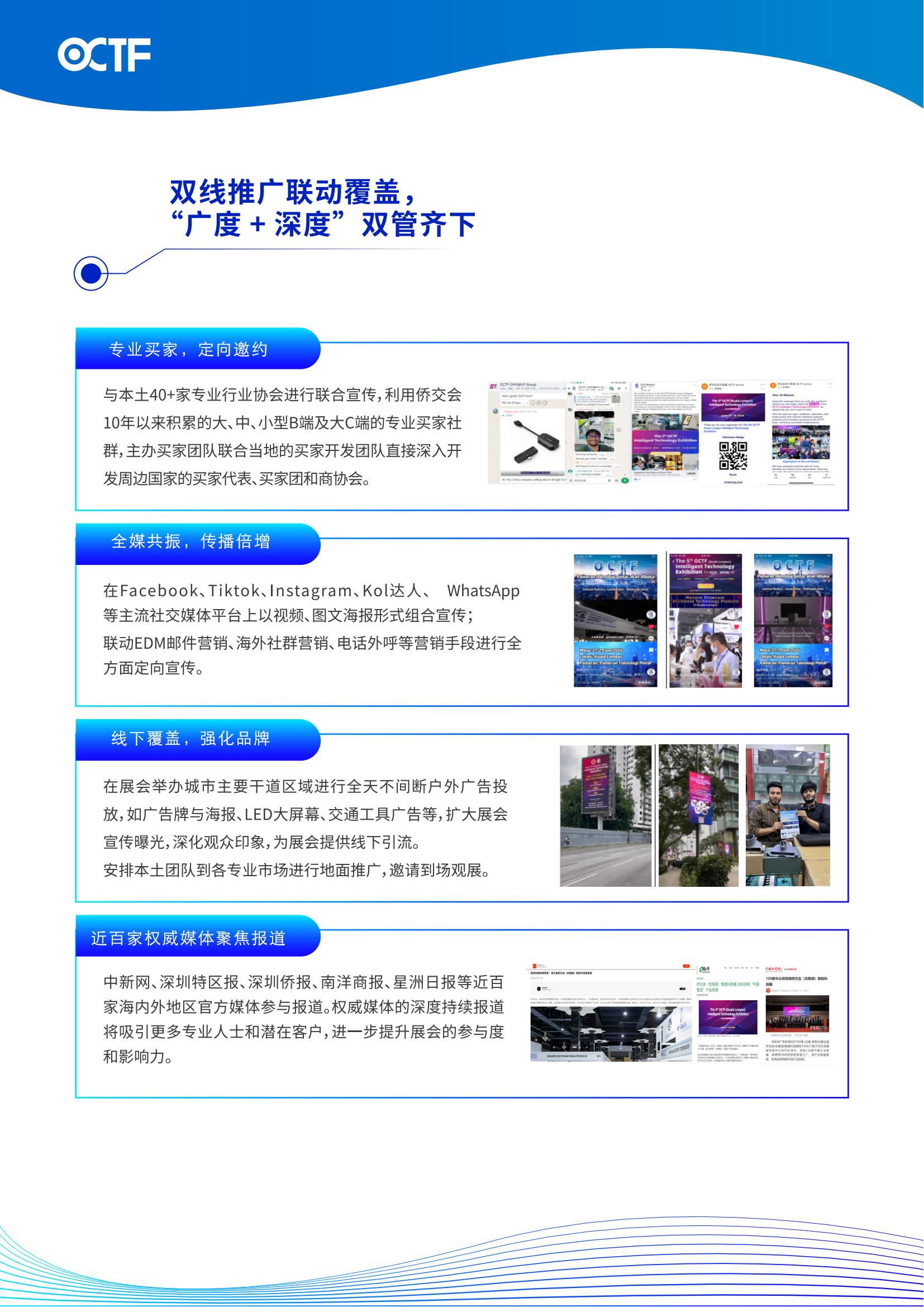 全方位宣传推广:包括海外主流社媒全年投放,EDM 实现个性化内容推送,网红打卡引爆流量,商协会组团观展等。