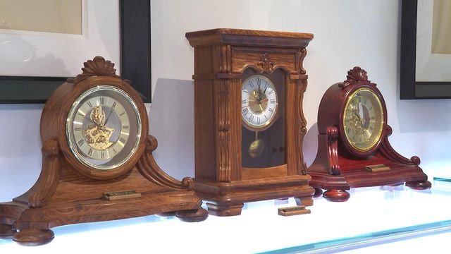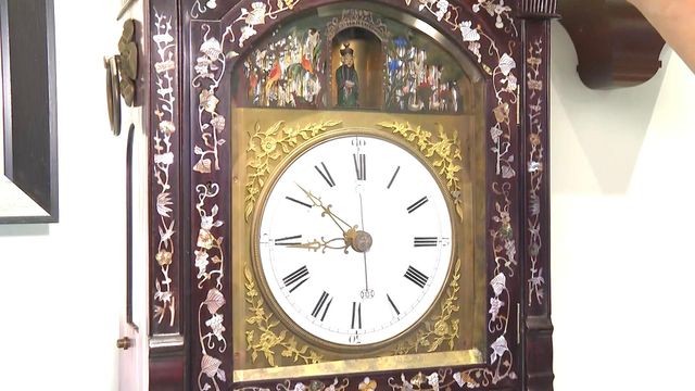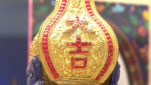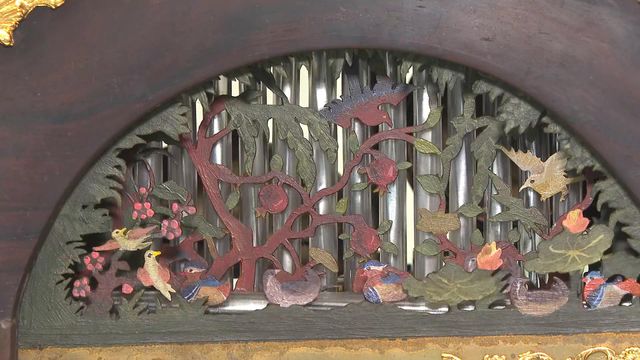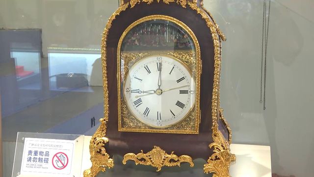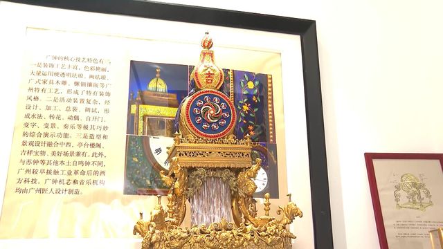 这台广钟仿照清朝乾隆年间的款式设计,外观看似静止,其实内藏小机关。半弧顶部用了“水法”技术,模拟鸳鸯在河流游动的场景。广钟是由广州钟表匠制作,有复杂活动装置,造型融合中西的机械时钟。