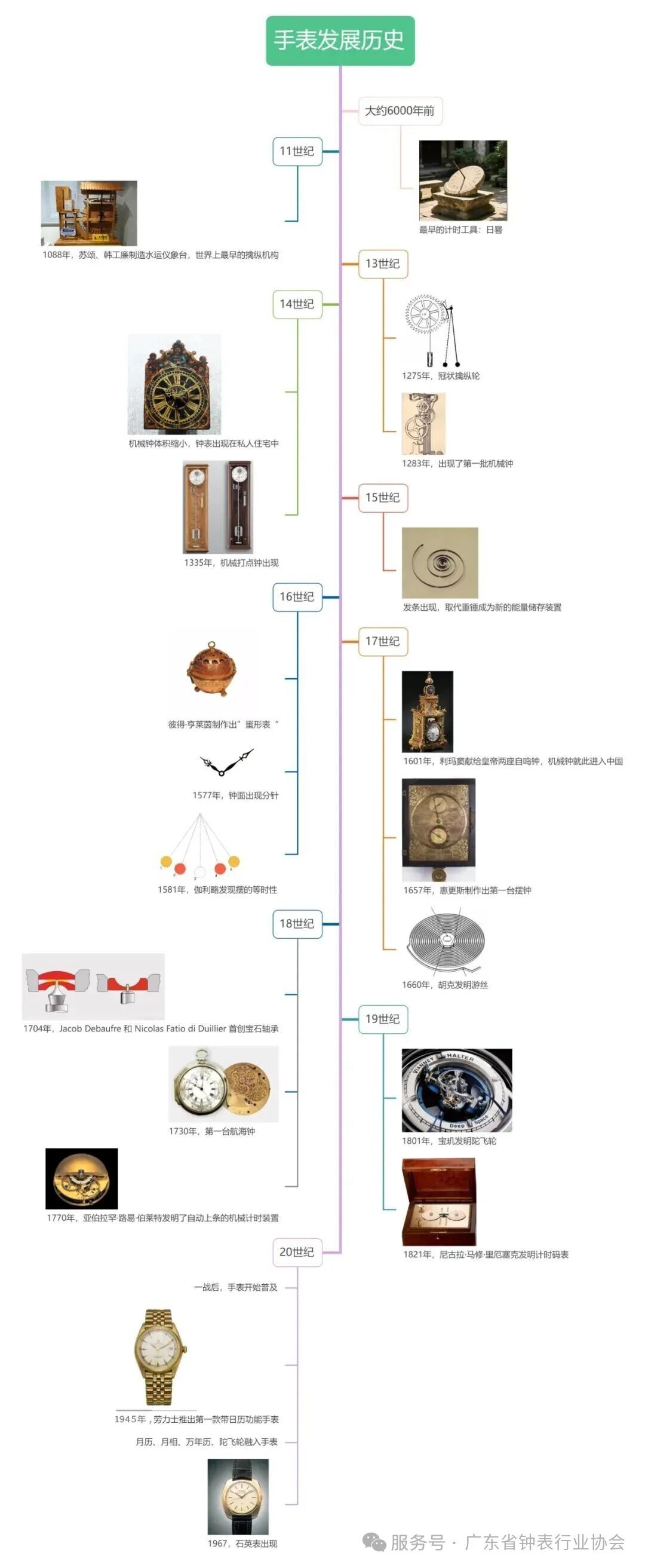 在人类文明的长河中,时间始终是一个重要的主题。手表,作为现代社会中最为普及的计时工具之一,其发展历程犹如一部波澜壮阔的史诗,见证了人类智慧的闪耀与科技的飞速进步。从最初简单的计时装置,到如今集精密机械、复杂功能与精湛工艺于一身的腕间艺术品,手表的演变反映了不同时代的技术水平、审美观念和社会需求。下面这张手表历史轴线图可以帮助我们更直观地了解手表发展的历程。