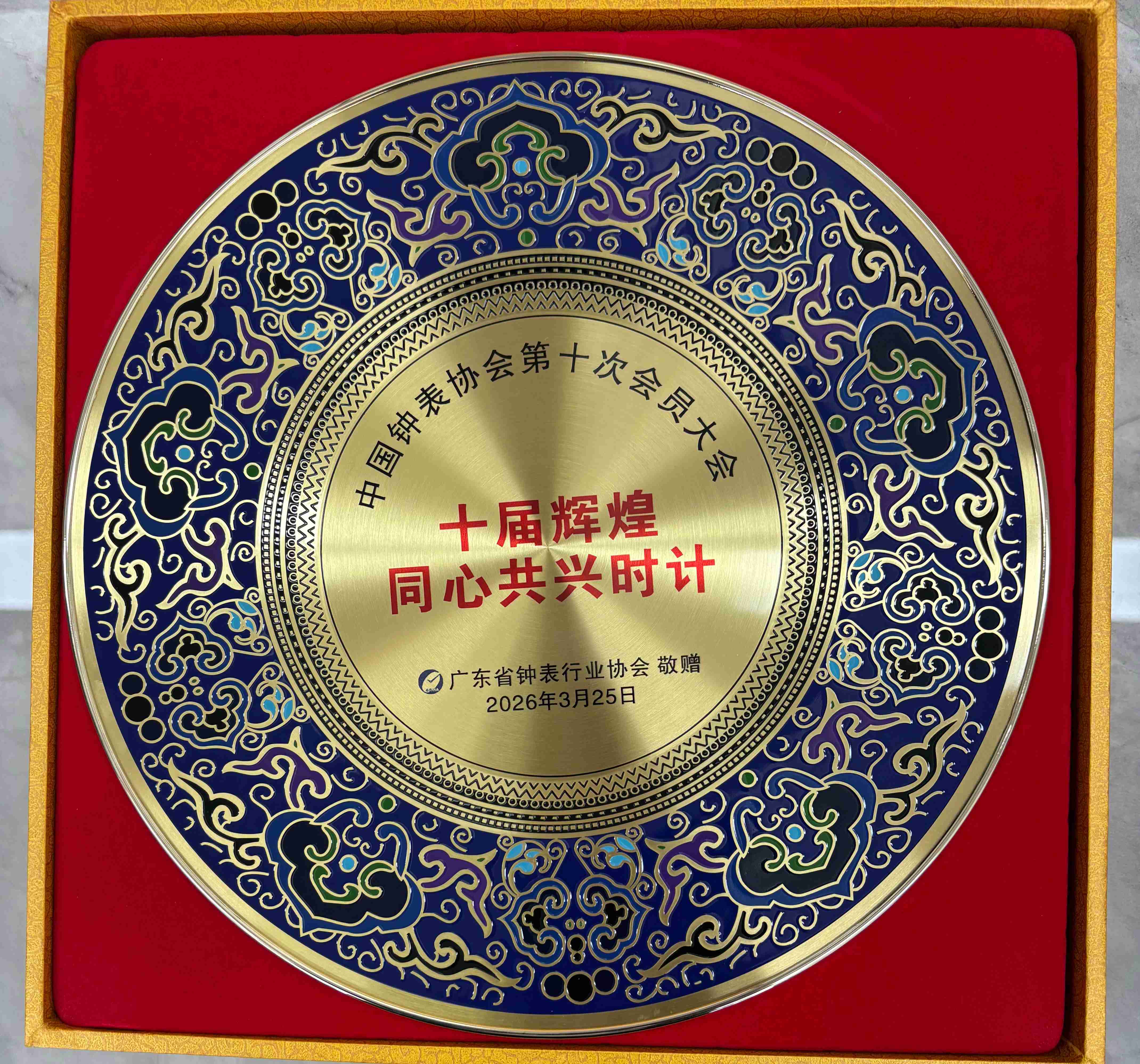 大会现场,广东省钟表行业协会向中国钟表协会敬赠 “十届辉煌,同心共兴时计” 纪念盘,以此致敬中国钟表协会十届发展的辉煌成就,彰显粤钟协与全国钟表行业同心同德、携手共进的坚定决心。这份纪念盘既是粤钟协对中国钟表协会引领行业发展的诚挚敬意,也是粤地钟表产业与全国行业深度融合的重要见证。