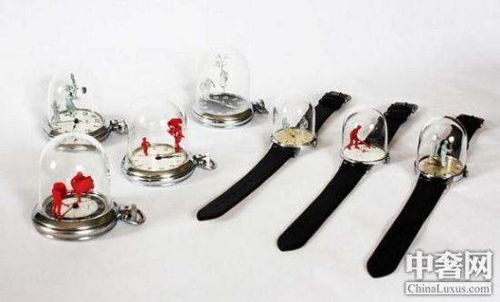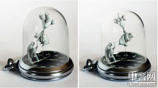 英国艺术家多米尼克。威尔科克斯在收集的老式机械手表和定制的人物模型基础上,创建了名为片刻时光(Moments in Time)的雕塑作品。威尔科克斯把微小的雕塑附加在了手表的指针上,这些雕塑随着时间移动,形成独特的动画场景。